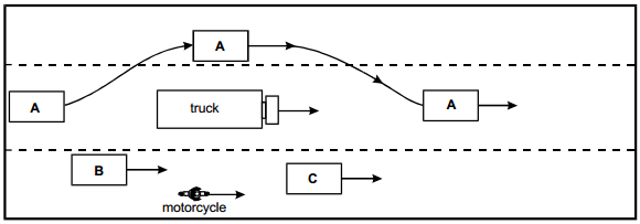 The diagram shows a view from above of a road with three lanes all traveling in the same direction. A large truck is in the center lane. There are three cars, labeled A, B, and C. Car A is behind the truck. Car B is to the right of the truck and slightly behind it, but also slightly in front of Car A. Car C is also in the right lane, slightly in front of the truck. A motorcycle is also in the right lane, between Car B and Car C, beside the truck. The diagram shows that Car A moves into the left lane, passes the truck, and returns to the middle lane in front of the truck.