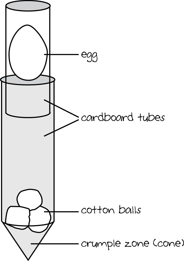 The diagram shows a vertically oriented cylindrical apparatus with labeled parts. At the top is a short cardboard tube with about a quarter of its bottom inserted into a longer cardboard tube. Both tubes are labeled cardboard tubes. The short tube contains an ovoid shape labeled egg which is oriented with the narrow end pointing upward. Inside the bottom of the longer tube are three roughly round objects labeled cotton balls. The very bottom of the long tube is cone shaped, with the point oriented downward. The label on this part says crumple zone and cone in parentheses.