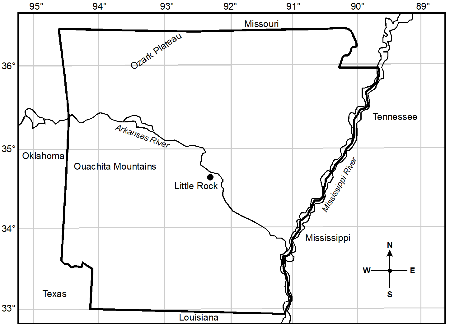 Map shows latitude and longitude lines indicating Little Rock near 34 point 5 degrees north longitude and 92 point 3 degrees west longitude, which is also near the center of Arkansas. The Ozark Plateau is labeled in the north of the state, and the Ouachita Mountains are labeled in the west of the state.