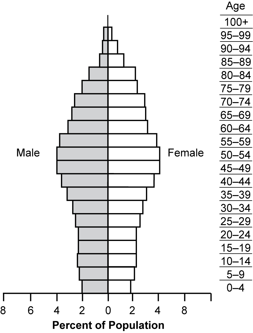 A visual representation of the age and sex composition of a population. Along the X axis are percentages for male and female members of the population on both sides of a Y axis. Along the Y axis are age groups in increments of five years extending from children at the bottom to age group one hundred plus at the top. The age distribution shows a bulging pattern. The largest groups at ages forty to sixty are more than twice as numerous as age groups in the eighties and teens.