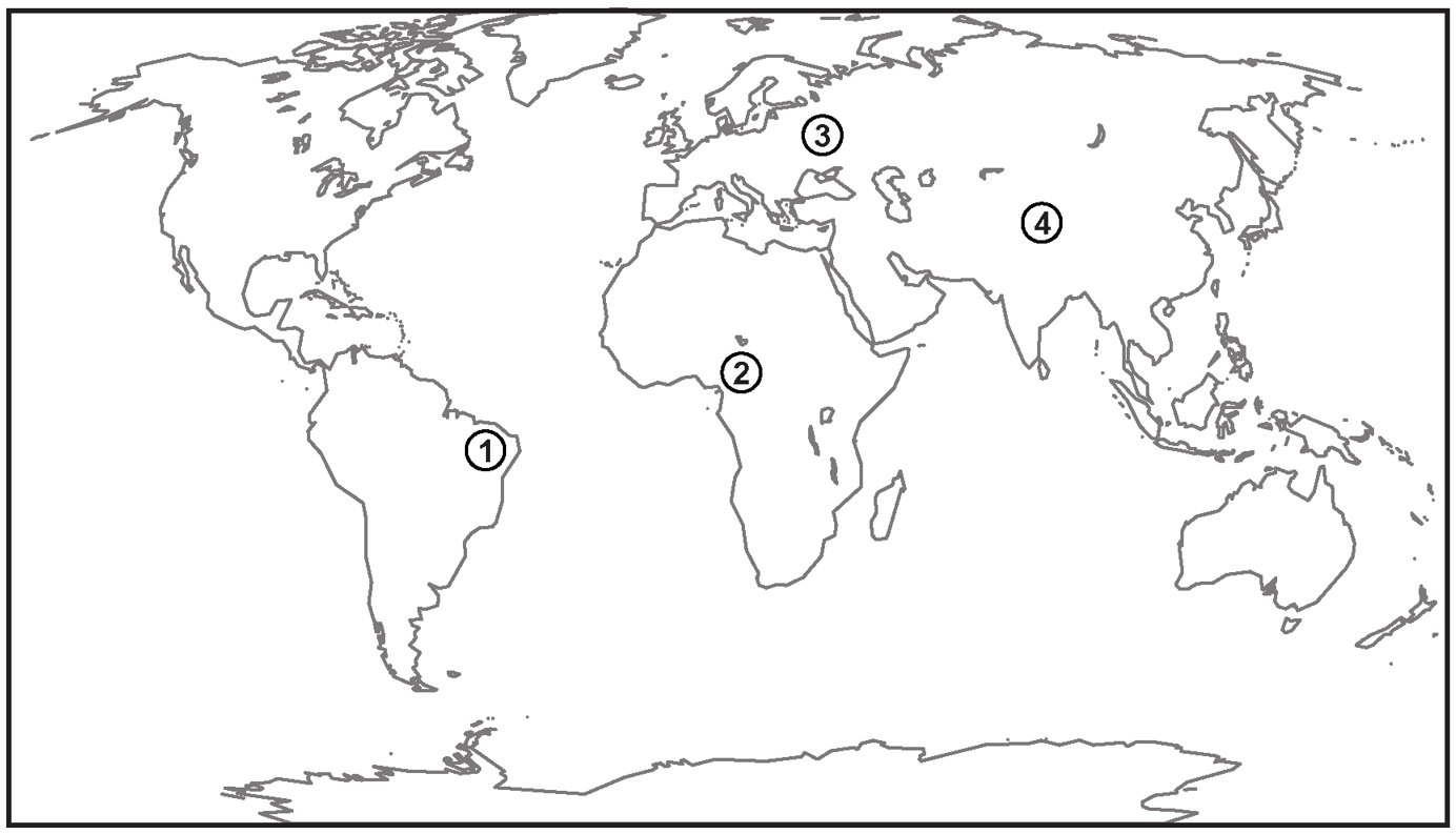 A map of the world with four locations labeled with numbers. Number one in the easternmost corner of South America. Number two in central Africa near where the east west Atlantic coastline bends southward. Number three in eastern Europe north of the Black Sea. Number four in central Asia north of the Indian subcontinent.