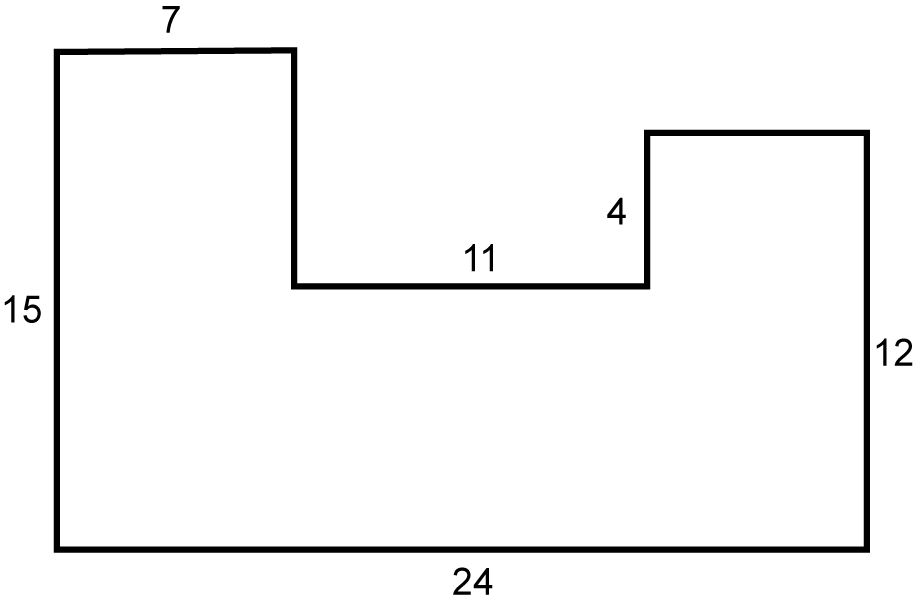 An irregular octagon with 8 right angles and an indented center on the top. The bottom length is labeled 24. The height of the left side is labeled 15 and the height of the right side is labeled 12. The top side is many different measurements. There is a length of 7 followed by an unlabeled height. Then there is a length of 11 followed by a height of 4. The final side of the top is an unlabeled length.