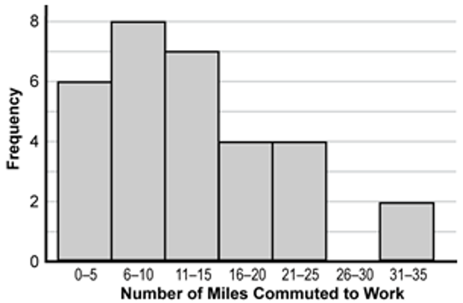 A bar graph with the horizontal axis labeled Number of Miles Commuted to Work and the vertical axis labeled Frequency. There are 6 bars for 7 spots on the x axis. The 0 to 5 bar goes up to the 6 on the Frequency axis. The 6 to 10 bar goes up to the 8 on the Frequency axis. The 11 to 15 bar goes up to the 7 on the Frequency axis. The 16 to 20 bar and the 21 to 25 bars both go up to the 4 on the Frequency axis. There is no bar for the 26 to 30 spot. The 31 to 35 bar goes up to the 2 on the Frequency axis.