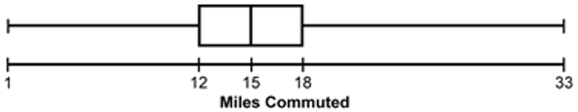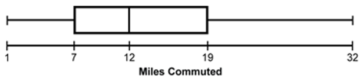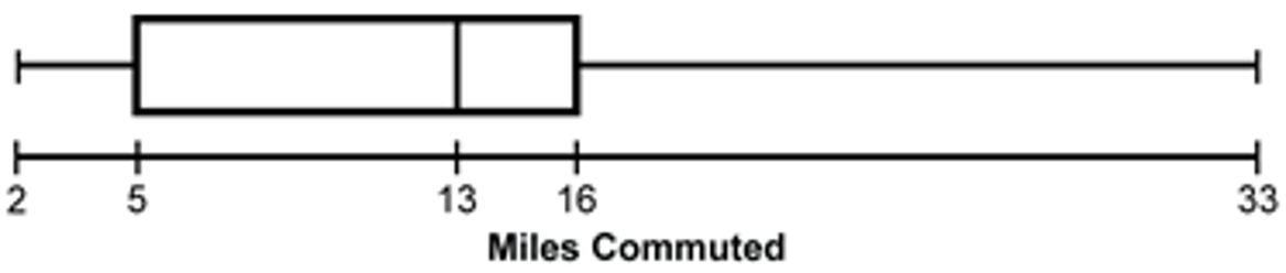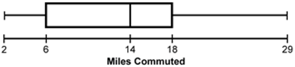 Each of the workers at a company has reported the number of miles they commute to work each day. The data are compiled in the graph above. Which of the following box plots could represent the data?