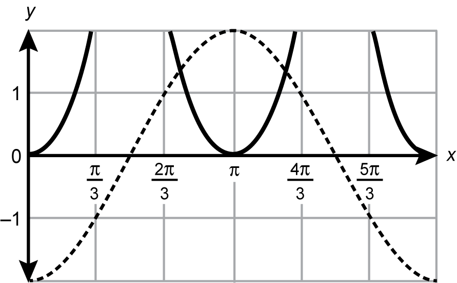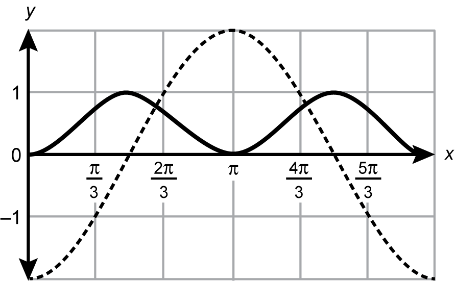 - A coordinate plane is shown with tick marks along the y axis at intervals of one from negative two to two and with tick marks along the x axis at intervals of pi over three from zero to two pi. A curve drawn with a dotted line starts at the point zero comma negative two, passes through three pi over six comma zero, reaches a maximum at the point pi comma two, then changes direction to pass through the point nine pi over six comma zero followed by the point two pi comma negative two. A curve drawn with a solid line starts at the point zero comma zero, rises to the point three pi over six comma one, decreases to the point pi comma zero, increases to the point nine pi over six comma one, and decreases to the point twelve pi over six comma zero.