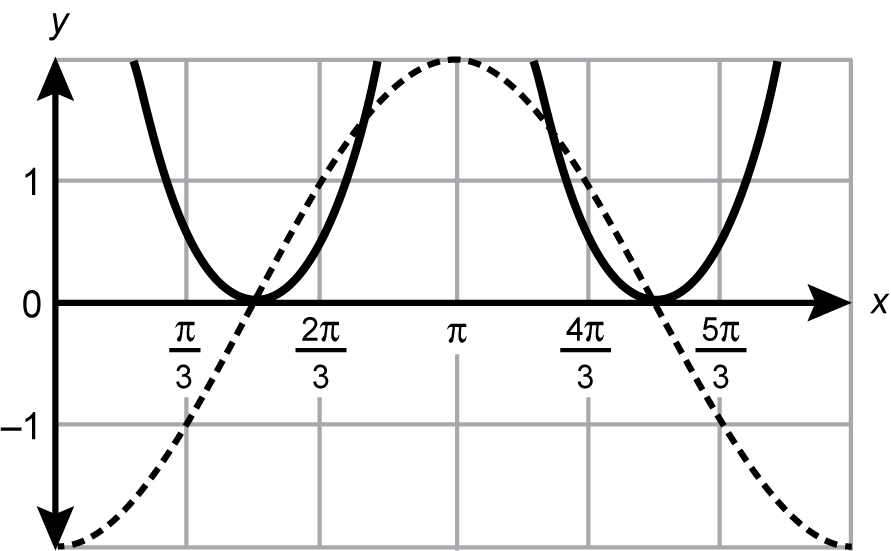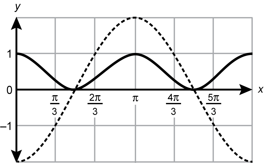 - A coordinate plane is shown with tick marks along the y axis at intervals of one from negative two to two and with tick marks along the x axis at intervals of pi over three from zero to two pi. A curve drawn with a dotted line starts at the point zero comma negative two, passes through three pi over six comma zero, reaches a maximum at the point pi comma two, then changes direction to pass through the point nine pi over six comma zero followed by the point two pi comma negative two. A curve drawn with a solid line passes through the point zero comma one, then decreases to the point three pi over six comma zero, then increases to the point pi comma one, then decreases to the point nine pi over six comma zero, then increases to the point twelve pi over six comma one.